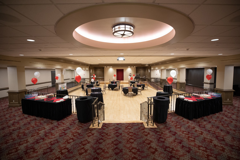 One of the most versatile rooms in the IMU, the Frangipani Room can host almost any type of event. The room features a large stage and is surrounded on three sides by a raised level that provides additional space for seating, displays, or catering. It is located on the main level near the East Lounge.