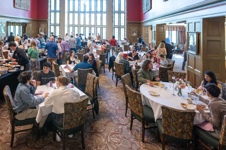 Similarly, the Tudor Room is a modern twist on age-old traditions. Built in 1959 as part of the $9.1 million Biddle Continuation Center, it serves as the flagship restaurant of the Indiana Memorial Union, offering fine dining experiences steeped in rich traditions dating back to medieval and Tudor England. A visit to the Tudor Room delights the senses as well as the palate with relics, artwork, and craftsmanship graciously gifted by donors and friends of IU. Our artwork is a mix of early paintings and contemporary pieces by both English artists and artists from our beloved state of Indiana.